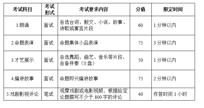 面试,通过抽题确定题目进行编讲故事的创作。基于编、讲两部分的不同侧重点对考生进行考察。编,要求考生对故事的命题理解要准确(不跑题),在理解规定题目的基础上,以生活为依据快速地进行故事情节的组织。考查考生的构思能力,对生活的感悟和理解能力;讲,要求考生把自己构思好的故事以讲述的方式生动地演绎出来。考查考生语言组织、形象思维和舞台表现力。