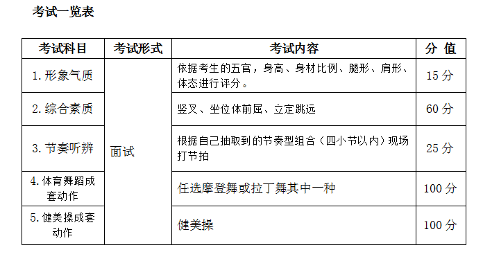 要求考生具有一定的柔韧性、弹跳力、平衡性。成套动作连贯、编排合理,能高质量地完成能力类别动作,具有一定舞蹈表现力。